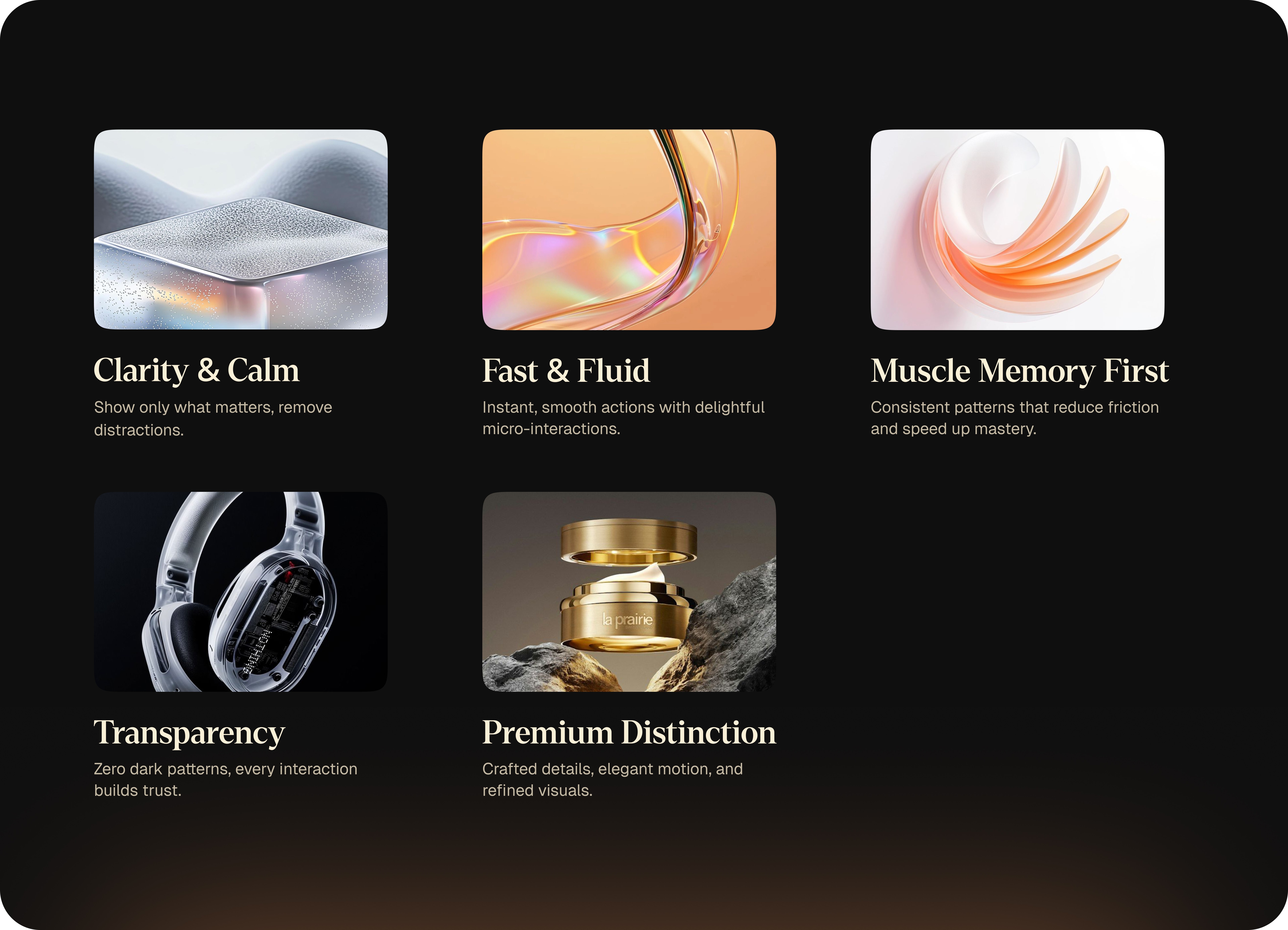 Premium, frictionless experiences that build trust through clarity, speed, and elegance with intuitive flows, delightful moments, and a calm, second-nature interface.